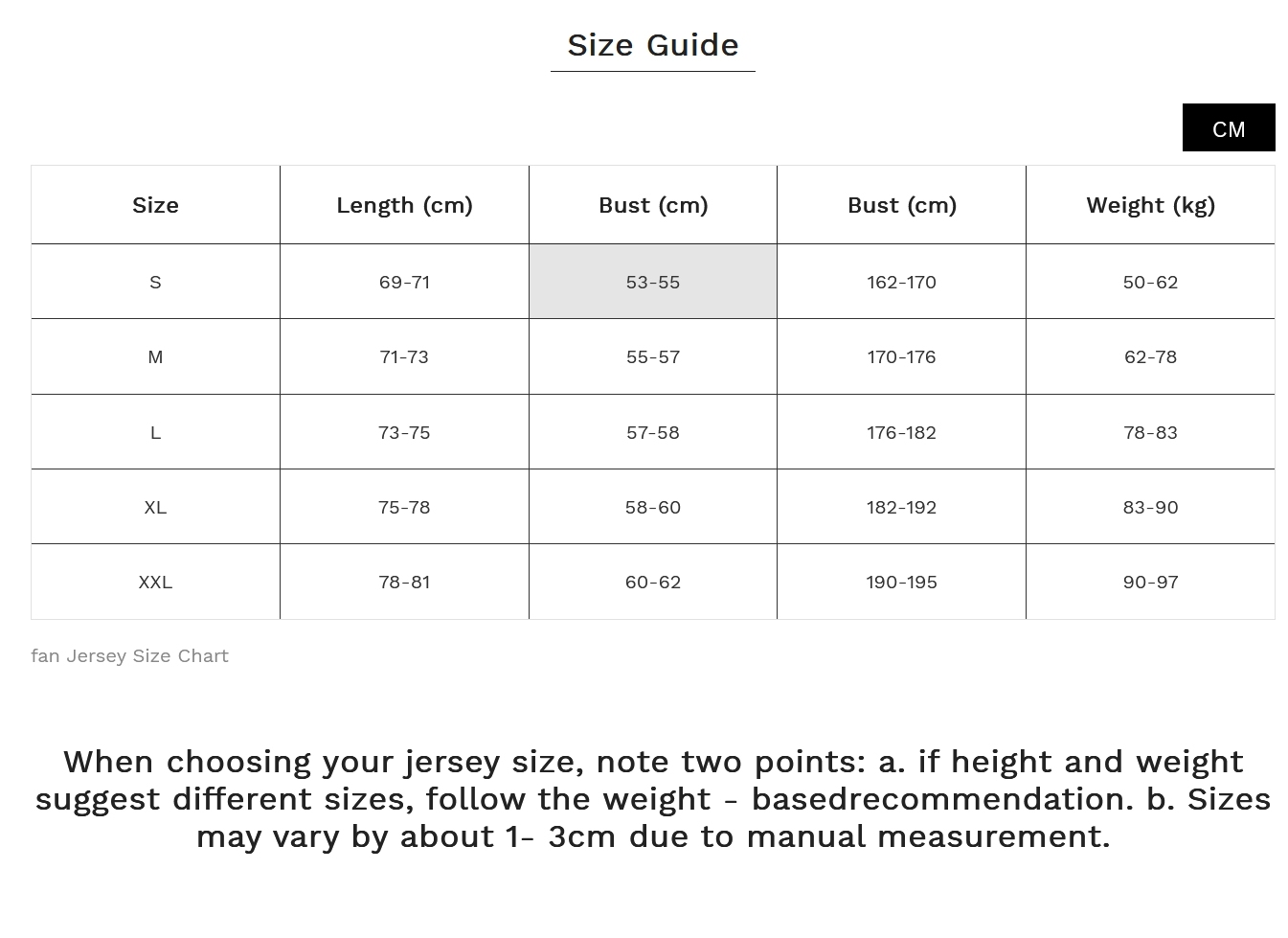 Please note: We recommend choosing a size larger than your usual size, as sizing standards vary among different manufacturers, and the shirts are fan-issue (which may have a looser fit).
