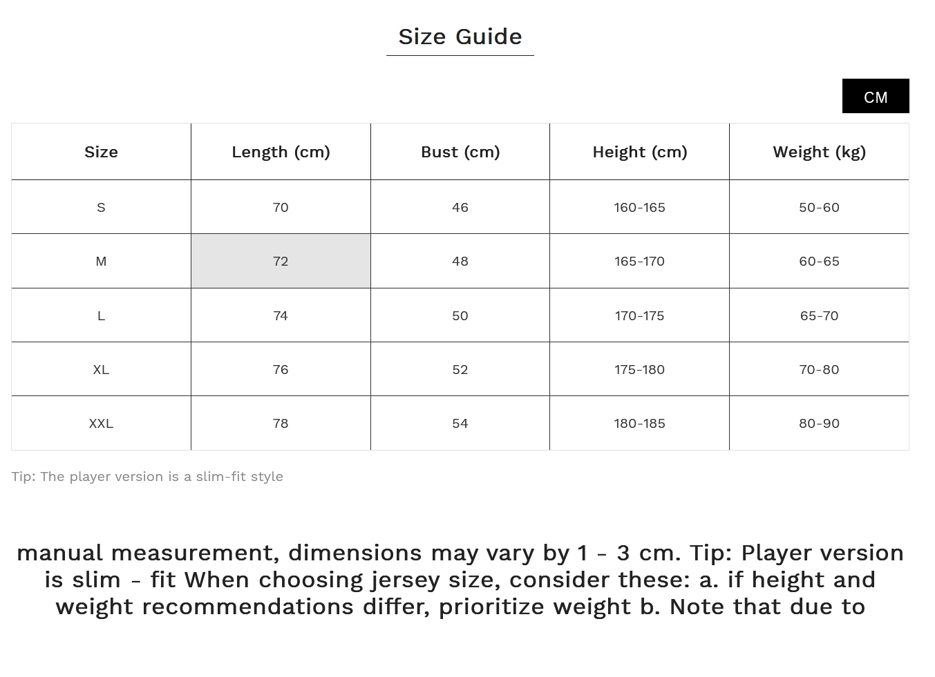 Please note: We recommend choosing a size larger than your usual size, as sizing standards vary among different manufacturers, and some shirts are player-issue (which may have a slimmer fit).