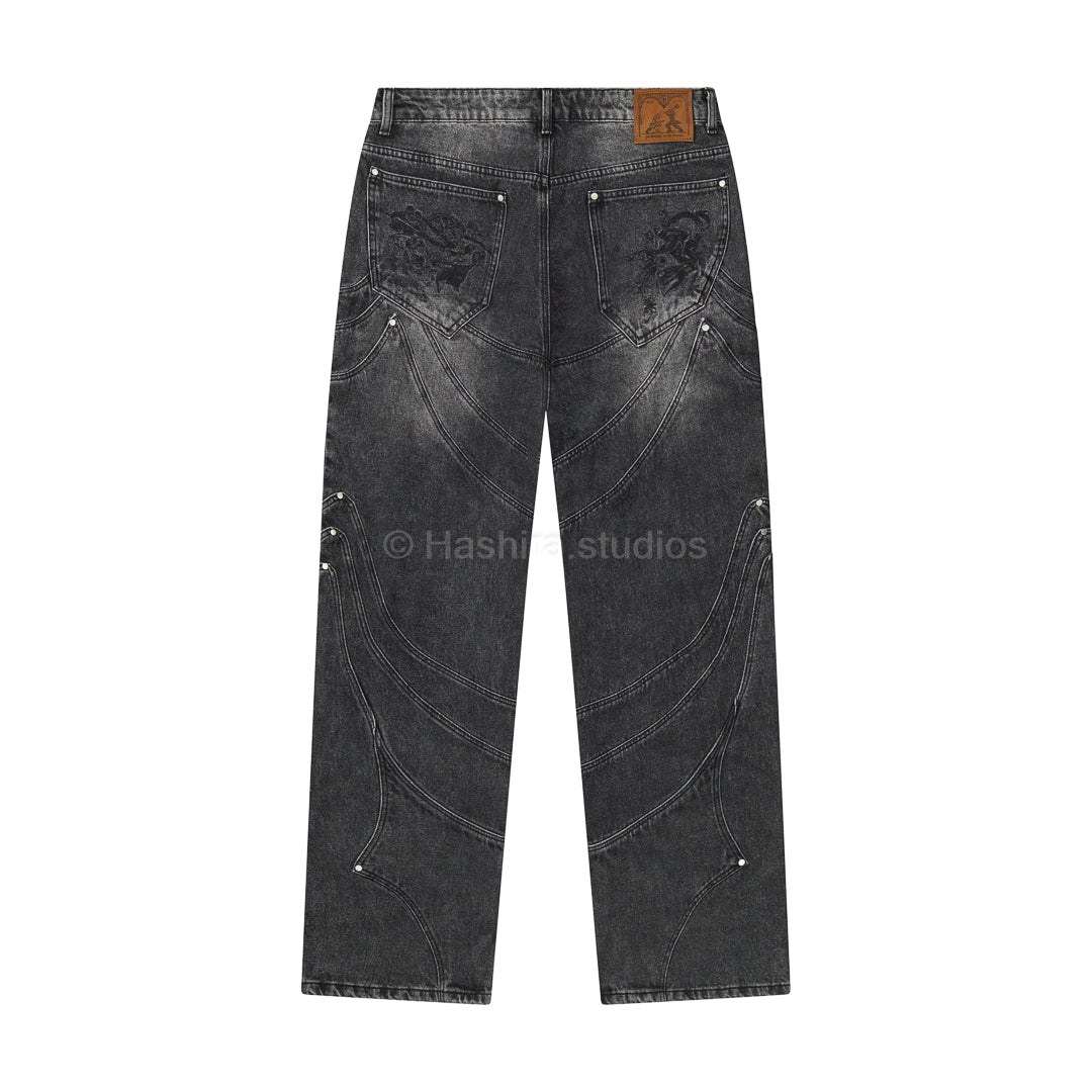 - Constructed leg armored inspired paneling + metal rivet hardware.