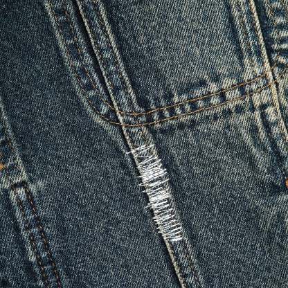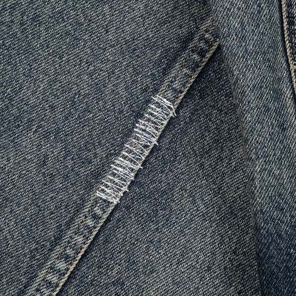 14,5oz denim / 100% cotton / woven design on back / distressed all over with backing patches underneath (not see-through) / true to size