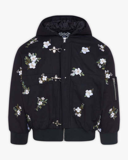 The Bloom Jacket combines a relaxed cropped silhouette with intricate all-over embroidery. 10+ unique Hibiscus floral motifs are stitched across the jacket, bringing depth and texture to the black canvas. Finished with a covered front zip, 3 fireman clasp metal fastenings, and spacious pocket details.