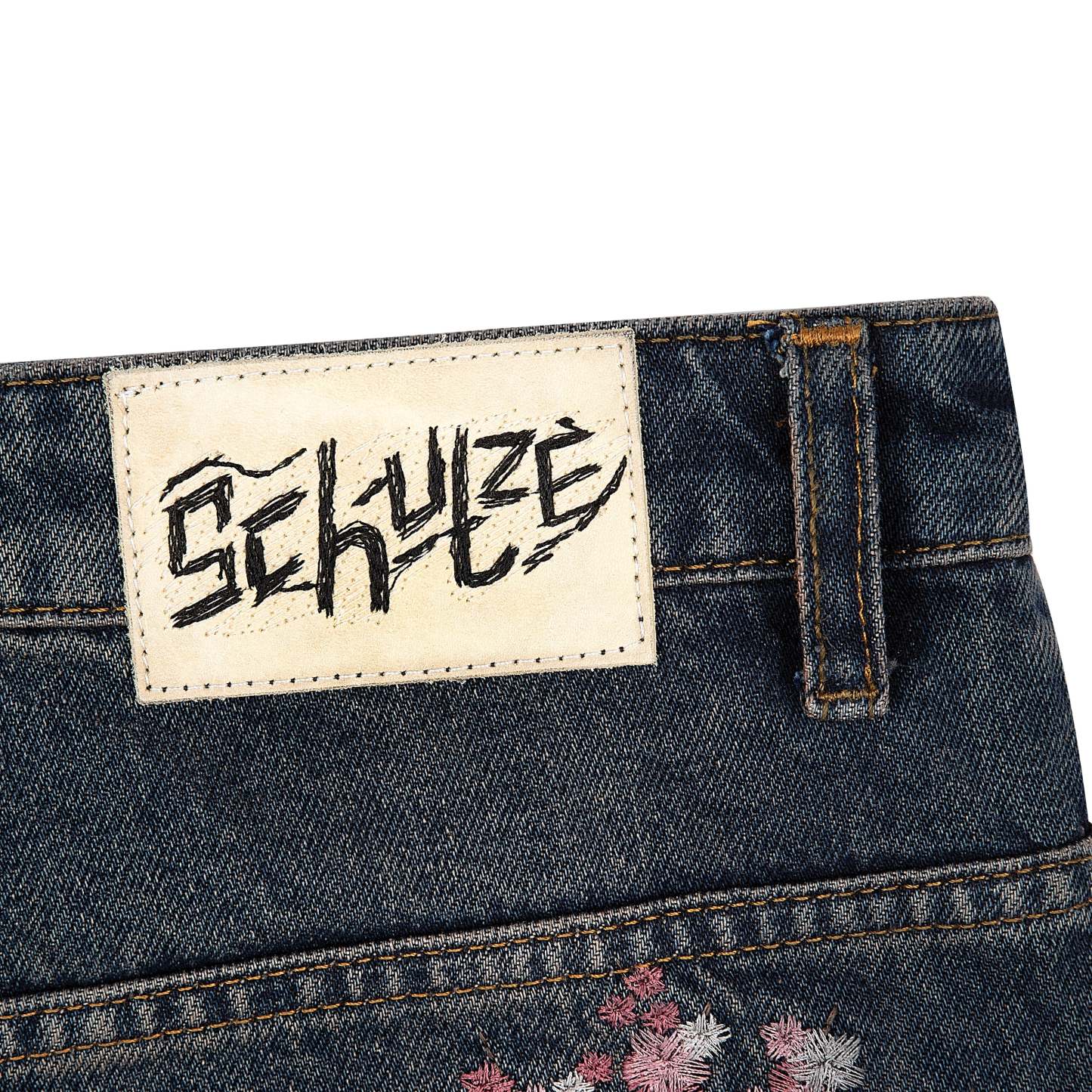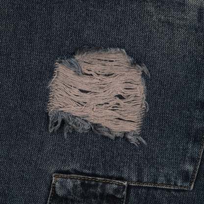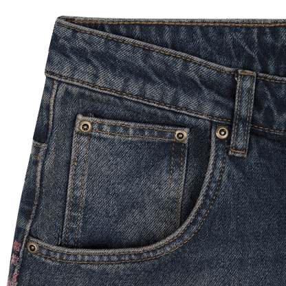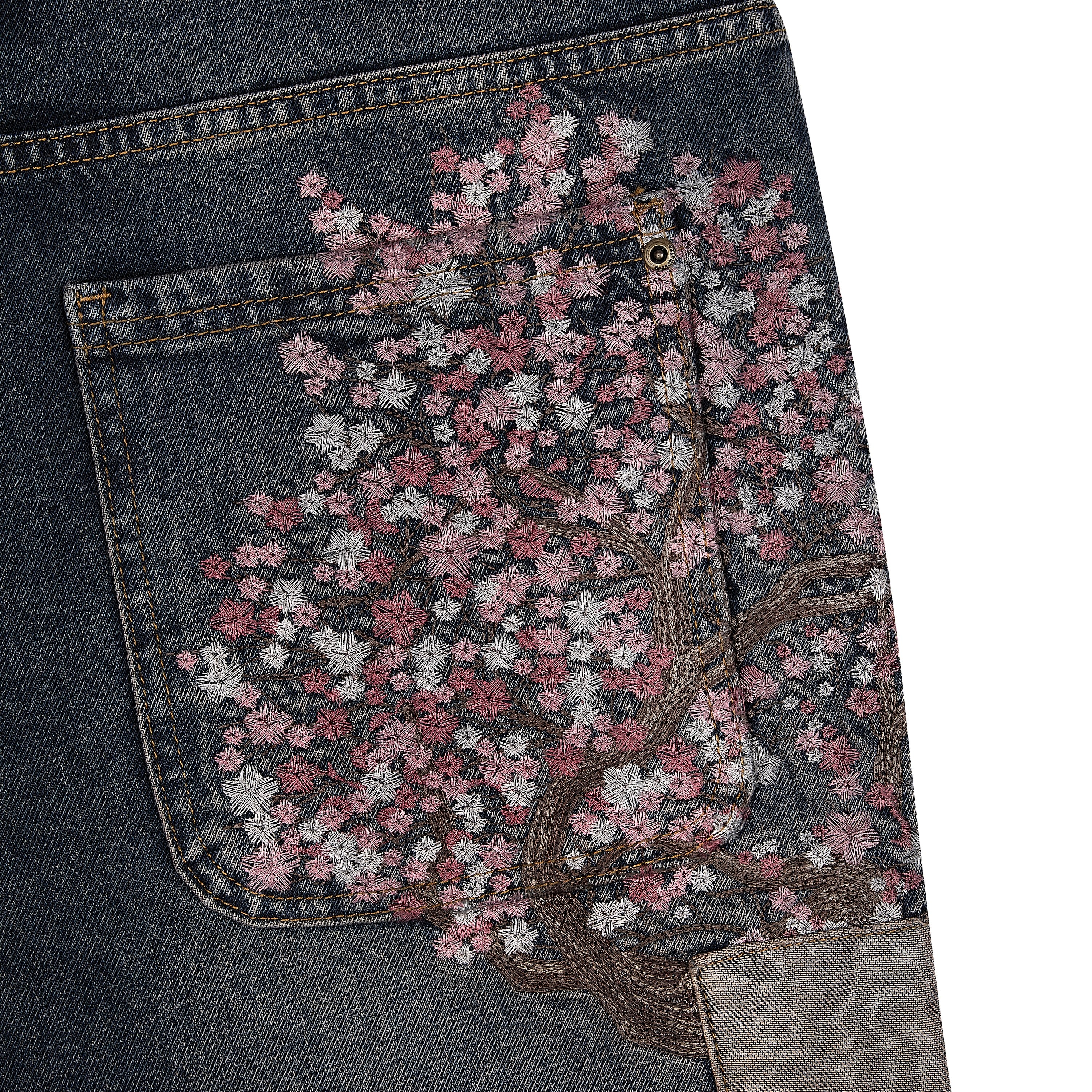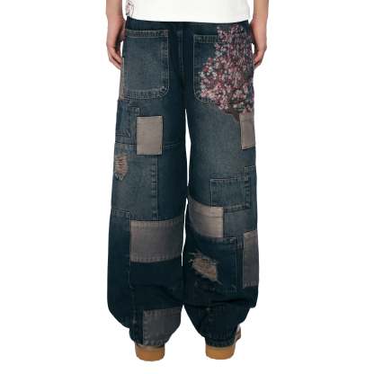 14,5oz denim / 100% cotton / 20+ hand sewn patches all over / embroidery on front pocket and back / embroidered leather patch / washed effect / distressed patches / wash inside out / fits true to size