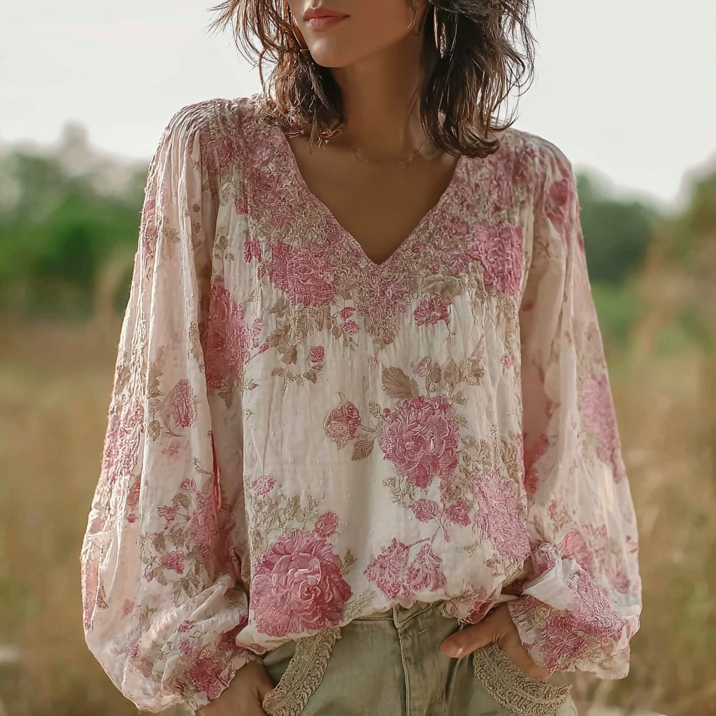 Bohemian Style Pink Floral Design V-neck Long-sleeve Top