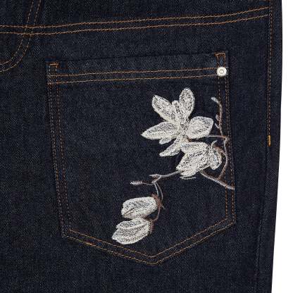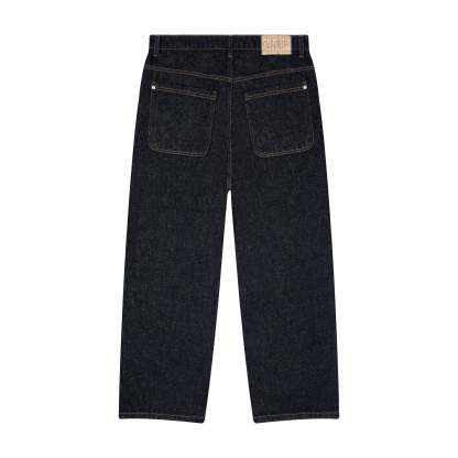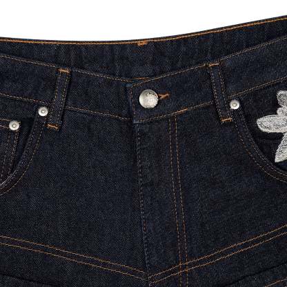 14,5oz raw denim / 100% cotton / yoke and back pocket look on front / embroideries on front pockets / plaid patterned deboss printed leather patch / custom button / baggy fit / fabric may bleed or fade, wash inside out in cold water to preserve color and character / fits true to size