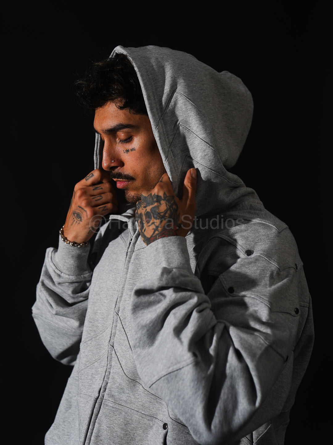 - Constructed sleeve and body armored inspired paneling + metal rivet hardware.