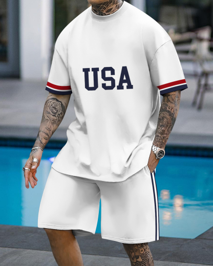 Men's fashion casual color matching printed short-sleeved two-piece set