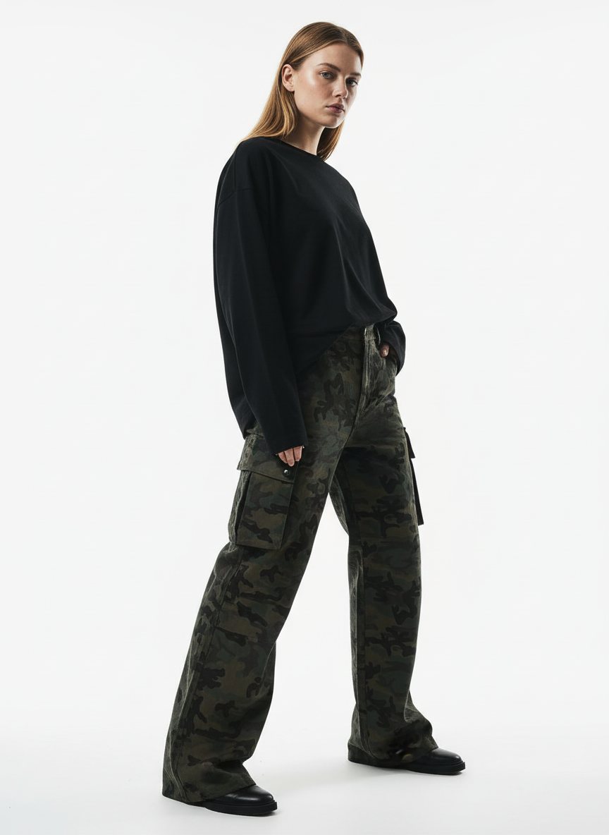 • Design Elements: Large side pockets, high waistband, relaxed fit