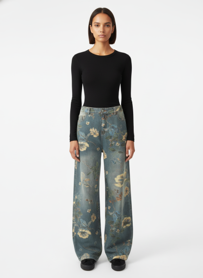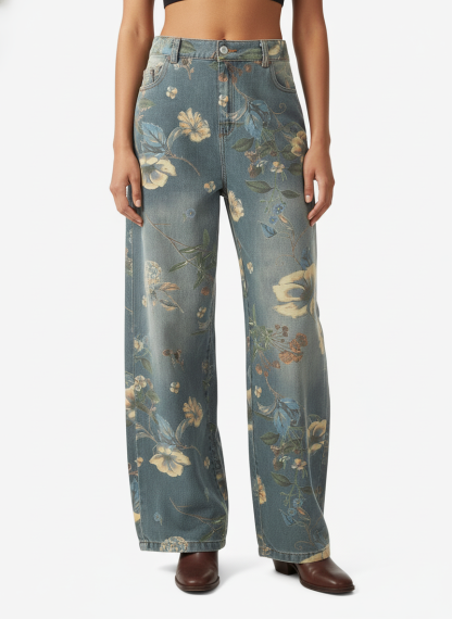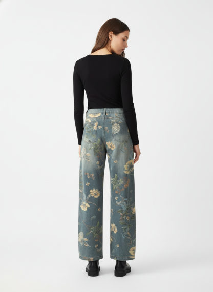 Denim Floral Print Carpenter Jeans - 2237
