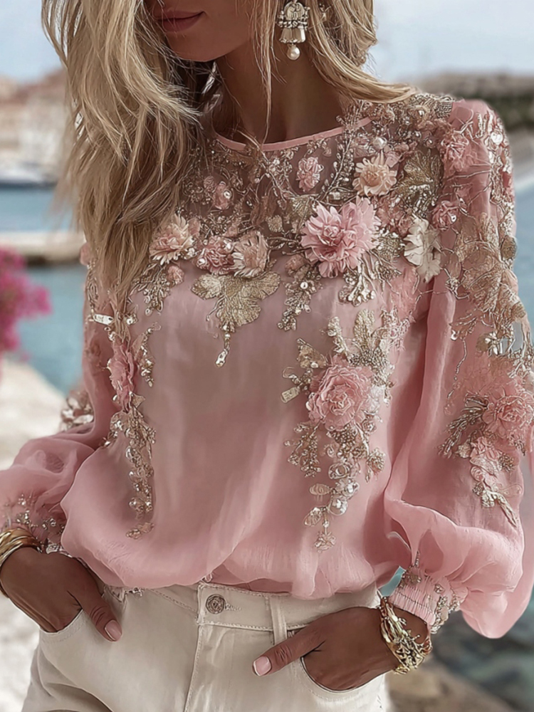 Women's Pink Flower Embroidery Art Round Neck Long Sleeve T-shirt