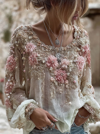 Women's Pink Rose Embroidery Art Round Neck Long Sleeve Linen Blend T-shirt