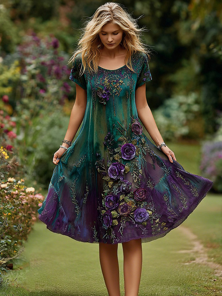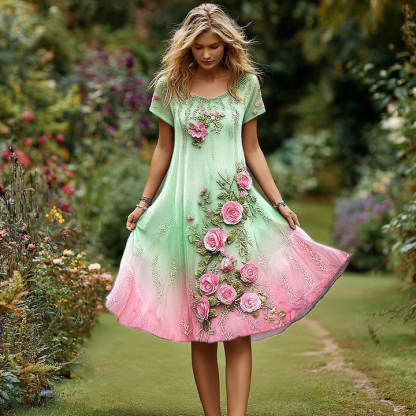 Women's Retro Floral Embroidery Gradient Pattern Round Neck Short Dress