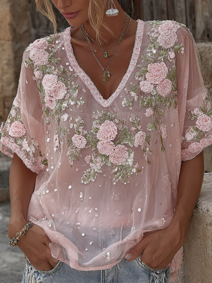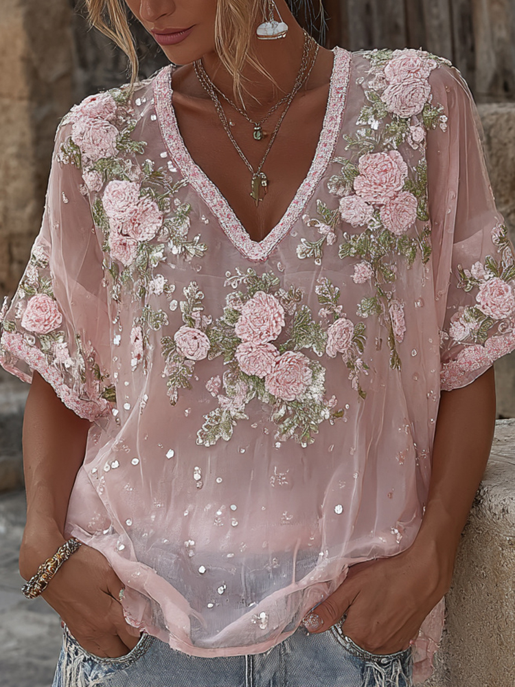 Women's Spring Floral Embroidered Art Print Flowy Linen Blend Short Sleeve Casual Tops