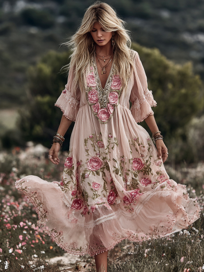 Women's Vintage Floral Art Linen Blend Casual Long Sleeve Maxi Dress