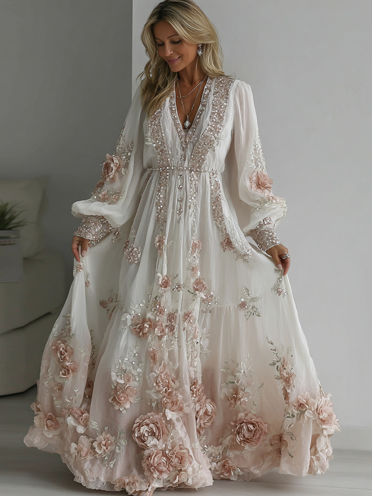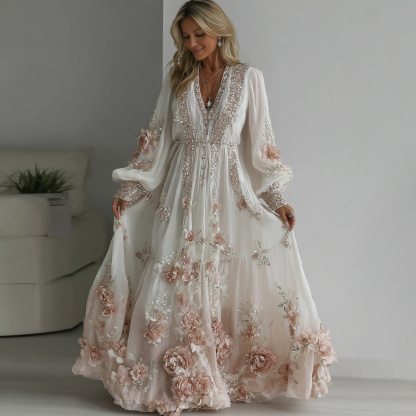 Women's Vintage Floral Embroidery Art Linen Blend V-neck Dress