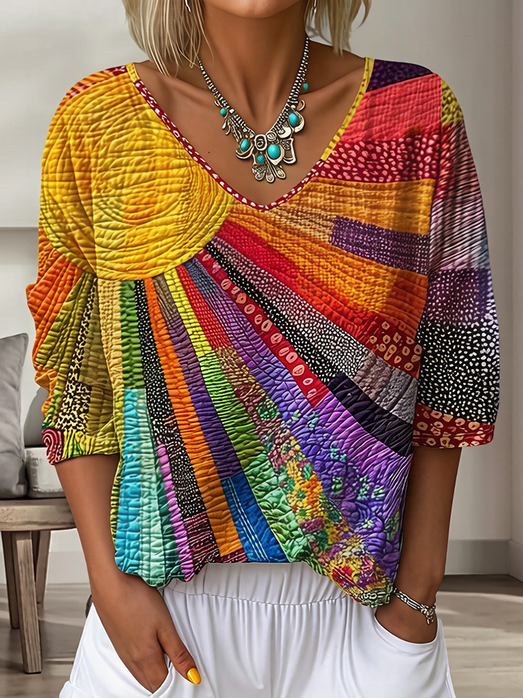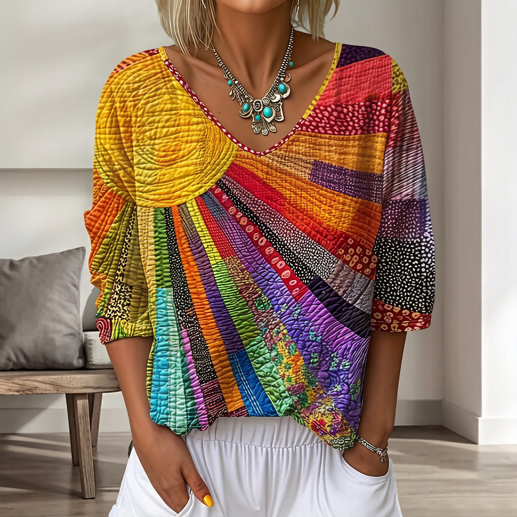 Women's Vintage Floral In Gradient Art Print Flowy Linen Blend Three-quarter Sleeve V Neck Linen Tops