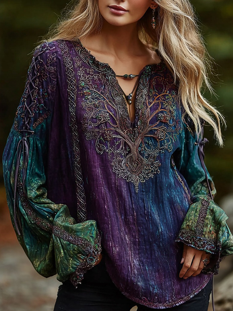 Women's Vintage Viking Celtic Knot Tree Of Life Art Gradient Pattern V-neck Shirt