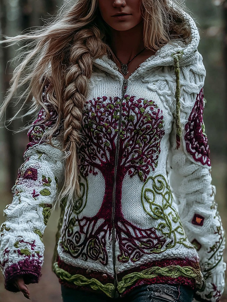 Women's Vintage Viking Celtic Knot Tree Of Life Art Knit Zip-up Hooded Sweater