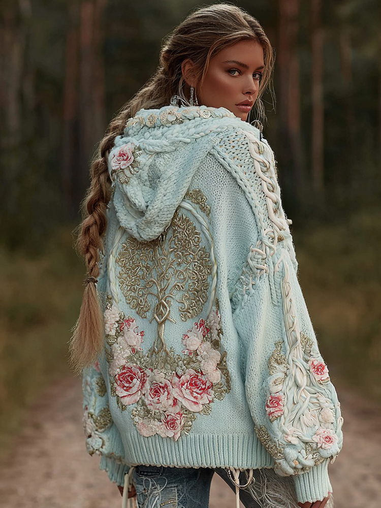 Women's Vintage Viking Metal Tree Of Life And Roses Knitted Hooded Sweater